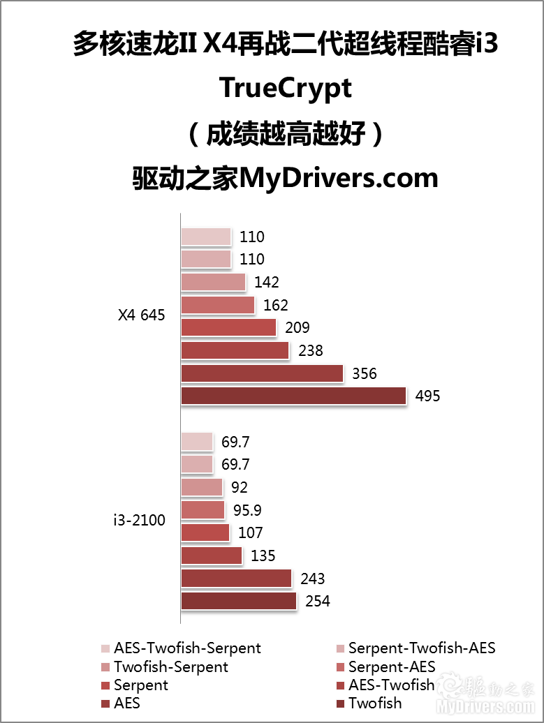 速龙II X4 645在八个子项目的测试中都明显更胜一筹,最少也有40%以上,AES加密项目就超过了一倍,Serpent项目更是领先1.2倍之多。在之前的羿龙II X6 1100T、酷睿i7-950对比测试中,物理六核心就以最高80%的幅度把逻辑十二核心甩在了身后。很显然,这个加解密工具非常喜欢物理多核心。