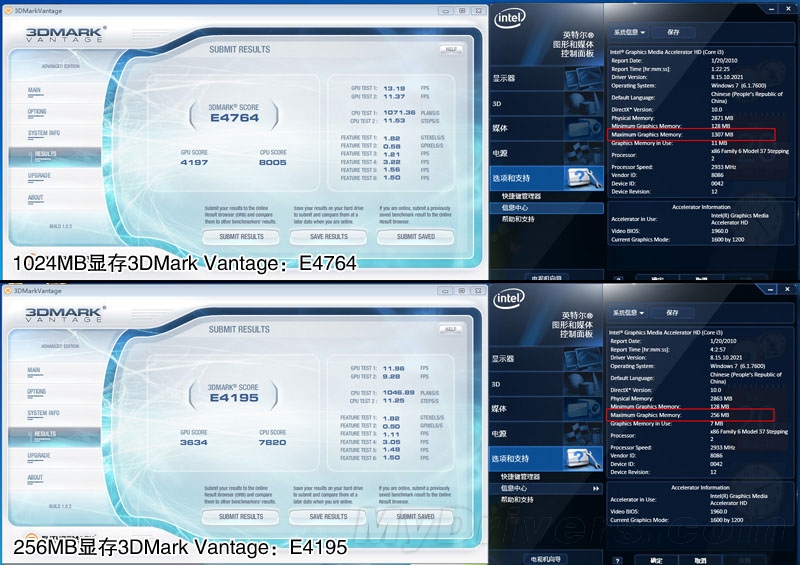 双敏UH55GT针对酷睿i3/i5/奔腾G内置GPU(显示核心)的特点,特别设计了动态显存技术,在使用过程中,根据当时的负载,自动分配所需的最大显存容量,双敏UH55GT最大可给酷睿i3内置GPU共享到1300MB显存,而一般的主板都只能在128MB或256MB显存,从3DMark Vantage成绩上明显体现出来,两者性能相差高达15%。