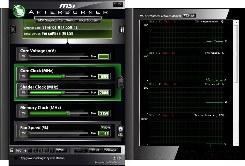 根据以往的测试经验,GeForce GTX 550 Ti超频能力相当不俗,体质稍微好点的核心在风冷条件下突破1GHz也并非难事,下面就来看看这款显卡的超频能力如何。工具采用通用性比较高的微星Afterburner,版本2.1.0,默认电压,风扇转速41%。