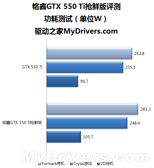 默认频率高了,功耗也自然水涨船高。三种状态下,铭鑫GTX 550 Ti相比公版GTX 550 Ti分别有大约9瓦/13瓦/19瓦的功耗提升,基本在可接受范围之内。