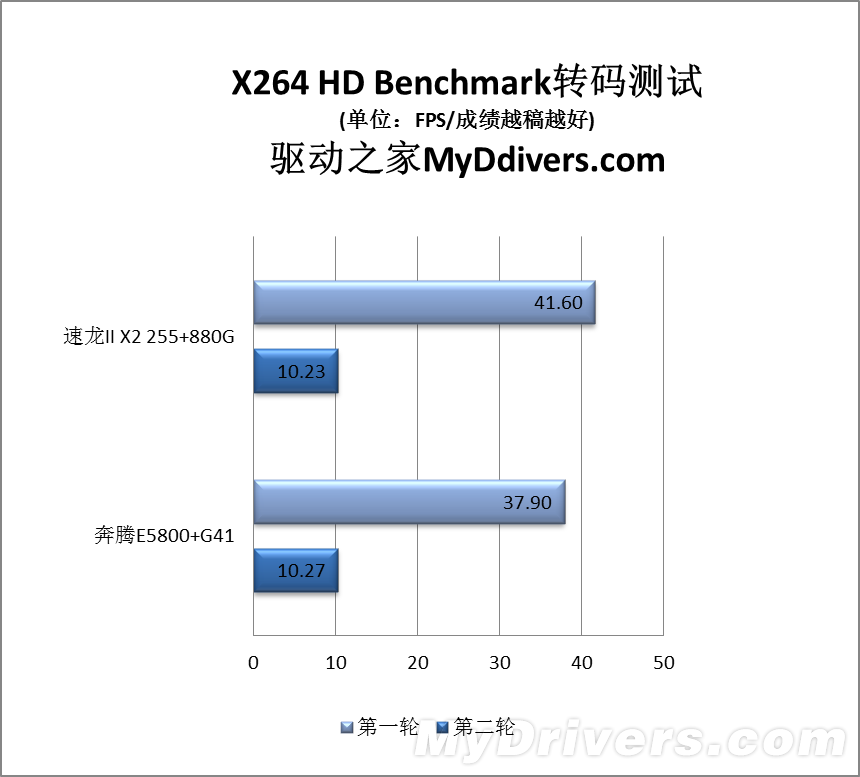 两回合测试中,速龙II X2 255在第一回合领先奔腾E5800 3.70FPS,幅度达到了10%,第二回合则不分彼此,仅仅差了0.04FPS。