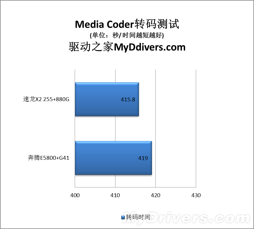 Media Coder也是常用的视频转码软件和测试工具,在这里速龙II X2 255又一次取得领先,比对手快了3.2秒钟,基本上不分伯仲。