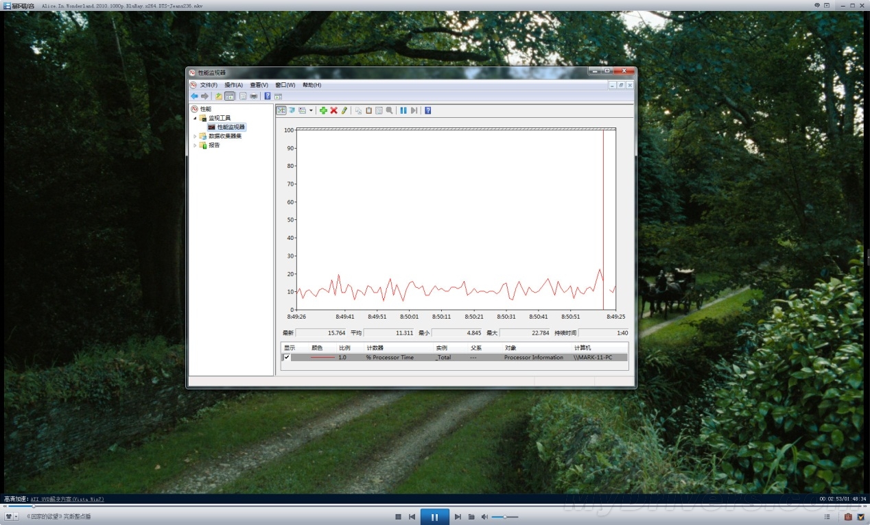 测试片源是非常典型的蓝光影片《爱丽丝梦游幻境》,1080p分辨率,H.264视频编码,平均码率大约10.5Mbps。测试过程中打开两套平台的硬件解码,分别观察CPU占用率和播放流畅度。