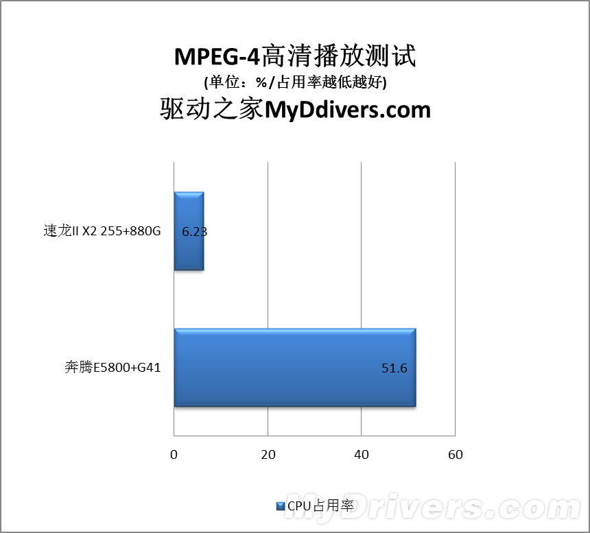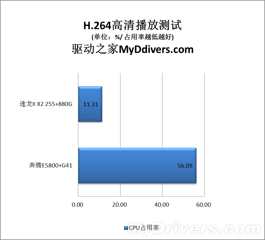 CPU占用率方面,速龙II X2 255搭配拥有完整硬件解码功能的Radeon HD 4250平均只消耗11%,而且完全流畅,硬解成功;奔腾E5800搭配在全高清解码上有所欠缺的GMA X4500则高达56%,且不时出现卡顿现象,无法流畅欣赏节目。