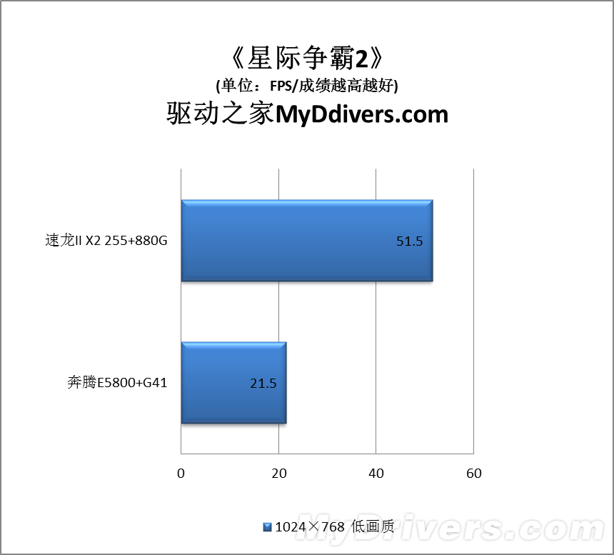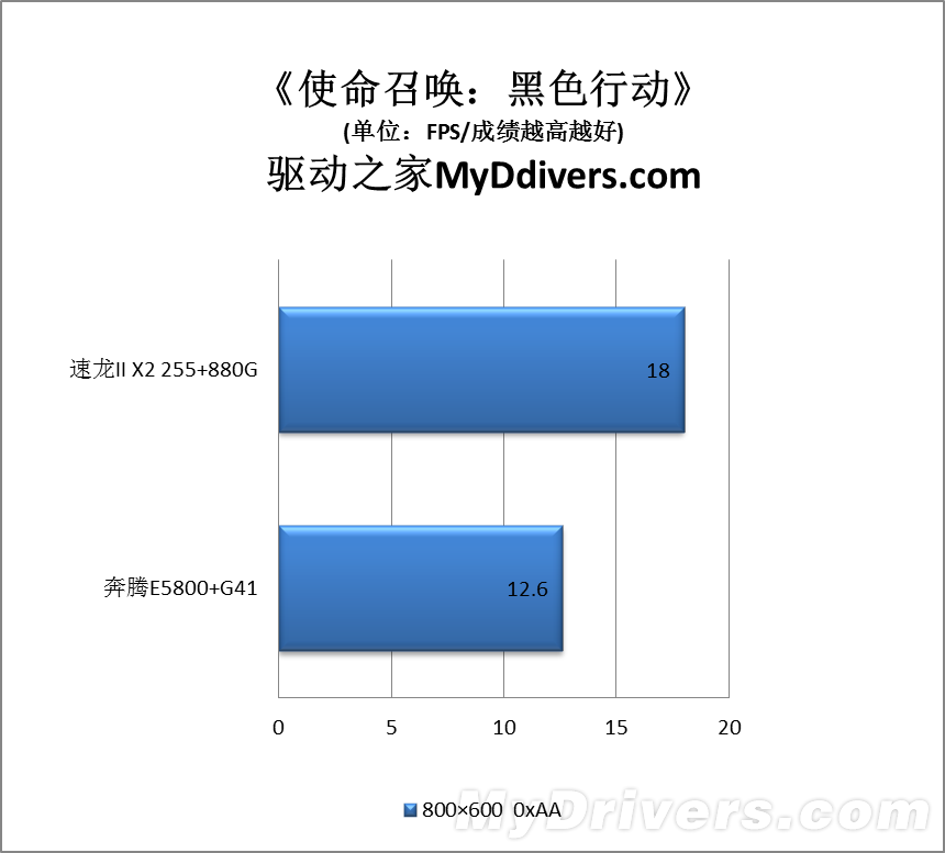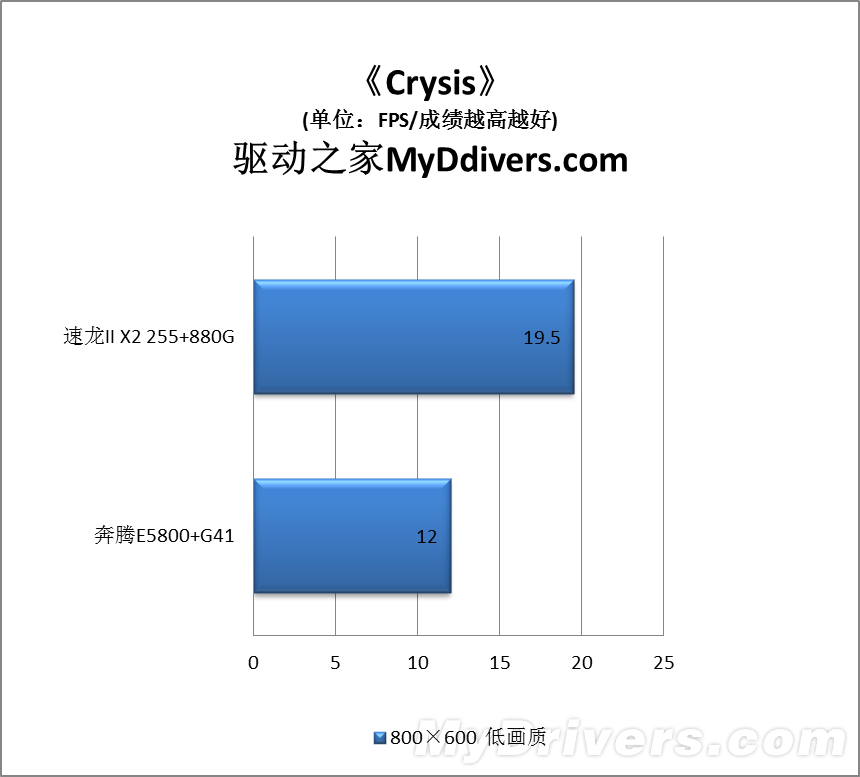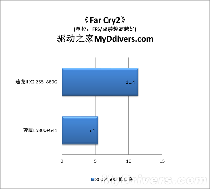 这部分我们测试了流行的四款游戏,包括两款DX9、两款DX10,为了照顾集成显卡都在1024×768或者800×600低分辨率以及低画质下运行。结果不出所料,速龙II X2 255加Radeon HD 4250完胜奔腾E5800加GMA X4500,其中《星际争霸2》领先多达1.4倍,最少的《使命召唤:黑色行动》也有43%,而且Radeon HD 4250在大部分游戏中都取得了基本流畅的效果,平均帧率基本不低于20FPS,GMA X4500则基本只在10FPS左右徘徊,《Far Cry 2》更是仅仅可怜的5FPS。