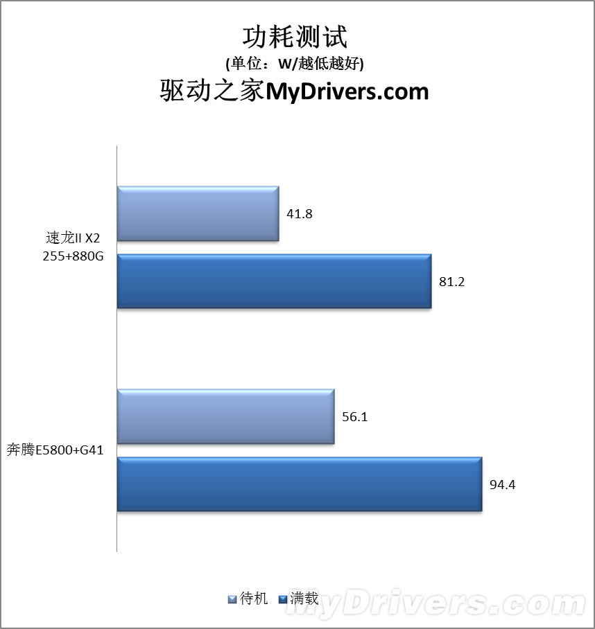 同样是45nm制造工艺,同样是65W热设计功耗,速龙II X2 255平台的功耗控制显然做得更好,待机时低了25%以上,满载时也低14%。事实上,两套入门级平台的功耗都非常低,满载最高也不超过100W(不含显示器),非常适合追求节能省电的用户。