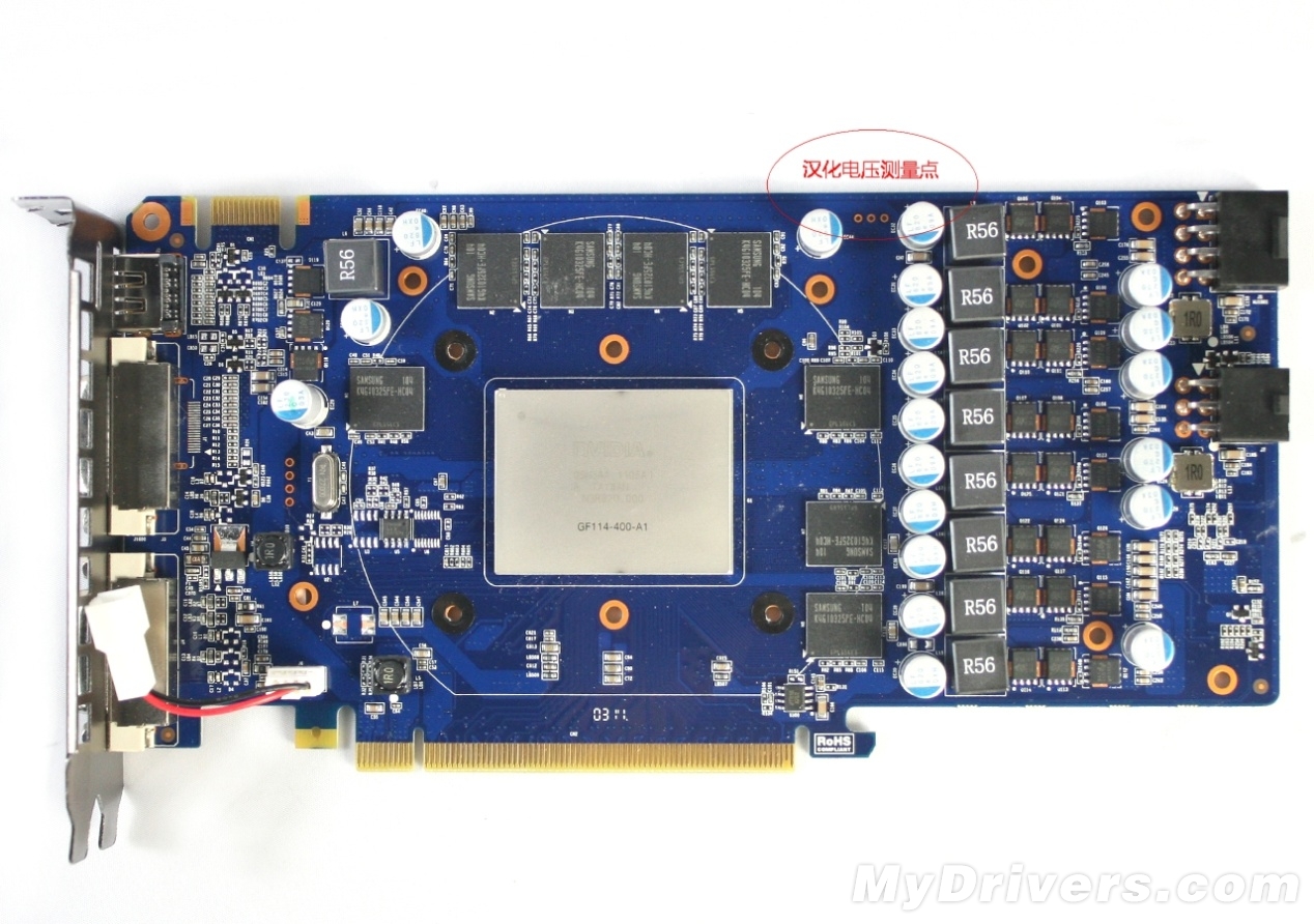 核心特写,40nm的GF114核心。核心内集成19.5亿晶体管,拥有384个CUDA核心,64个纹理单元,32个光栅单元。