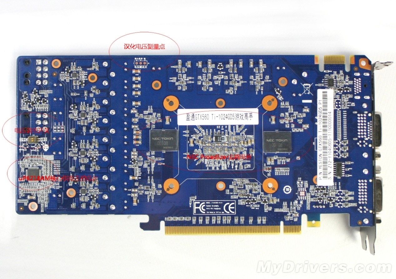 PCB背面。上图红色标识部分分别为:汉化电压测量点、电压调节开关、uP6218AM核心供电主控芯片、NEC Proadlizer去耦电容。