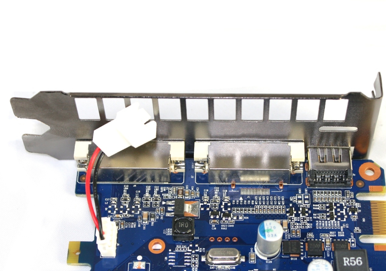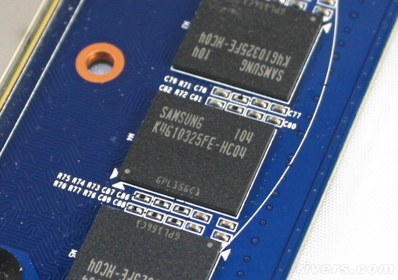 三星GDDR5 0.4ns显存,理论频率可达5000MHz。单颗规格为32M/32bit,PCB正面8颗共同组成1GB/256bit的显存规格。