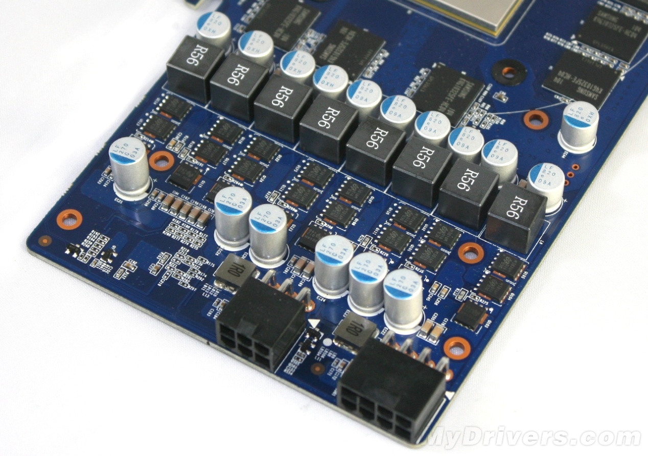 核心供电采用了8相,比公版卡足足多了一倍。每相供电搭配三颗uPI出品的SO-8封装的MOSFET,上桥为M3014H,下桥是两个M3016H。滤波电容来自日本尼基康的LF系列固态电容,电感则是清一色的R56全封闭式。夸张的核心供电并非是一味的堆料,而是显卡稳定超频的基础条件之一。另外,我们注意到,显卡采用了6+8pin供电接口,也是为了保证核心供电充足。