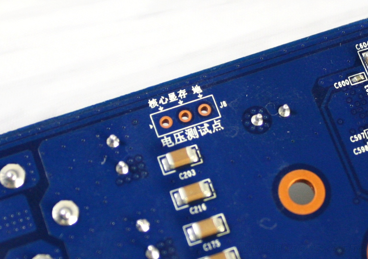 除了电压调节开关之外,盈通还在显卡PCB顶部设计了电压测量点,方便超频玩家实时监控显卡各部分的电压。为了照顾国内用户,盈通还非常人性化的将标识进行了汉化,从左至右分别为:核心、显存以及接地点,玩家可使用万用表测量显卡当前的实时电压。