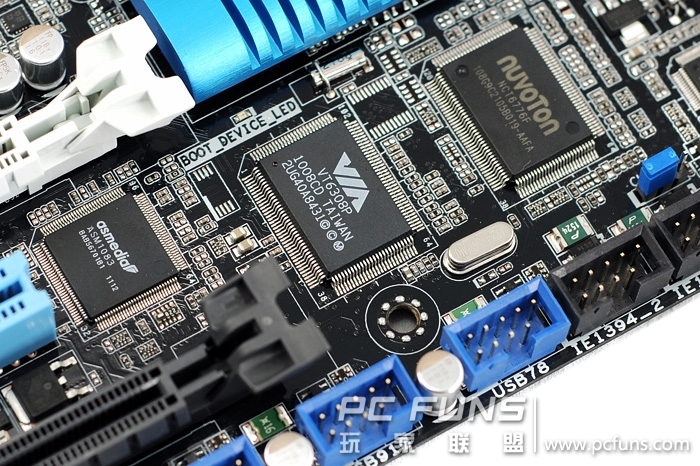 Intel在6系列芯片组上已经放弃了对PCI的原生支持,P8Z68-V PRO采用了一颗asmedia的ASM1083 PCI桥接芯片提供了一只PCI插槽,VIA的VT6038P提供了2×IEEE 1394a接口的支持,其中接口为下图黑色扩展,NCT6776F为super I/O芯片。