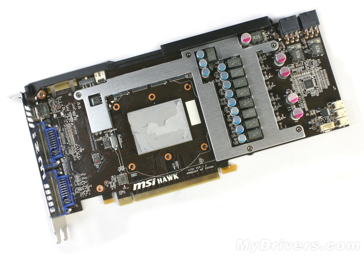 拿掉散热器后可以看到,再发热量大的显存以及MOS管部分都安装了辅助散热片,兼顾到散热器不能照顾到的部分。