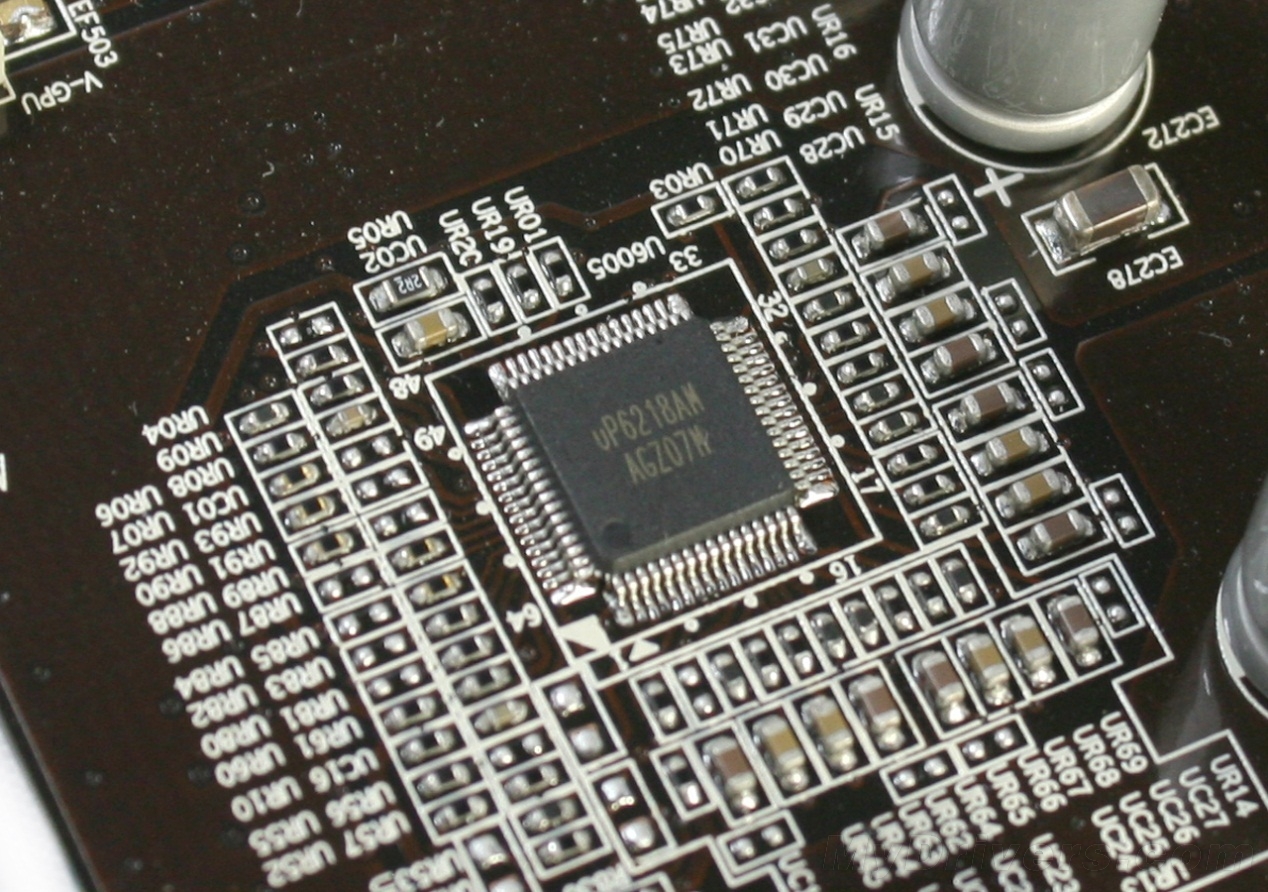 核心供电PWM主控芯片为uPI出品的uP6218AM,最高支持8相供电,普遍勇于两千元级别顶级主板上,支持最新的英特尔VRM11。由于这款芯片没有内置驱动IC,所以PCB背面采用了外置Driver式驱动,每颗uP6202芯片独立驱动2相供电,相比传统内置设计温度更低,驱动更精确。