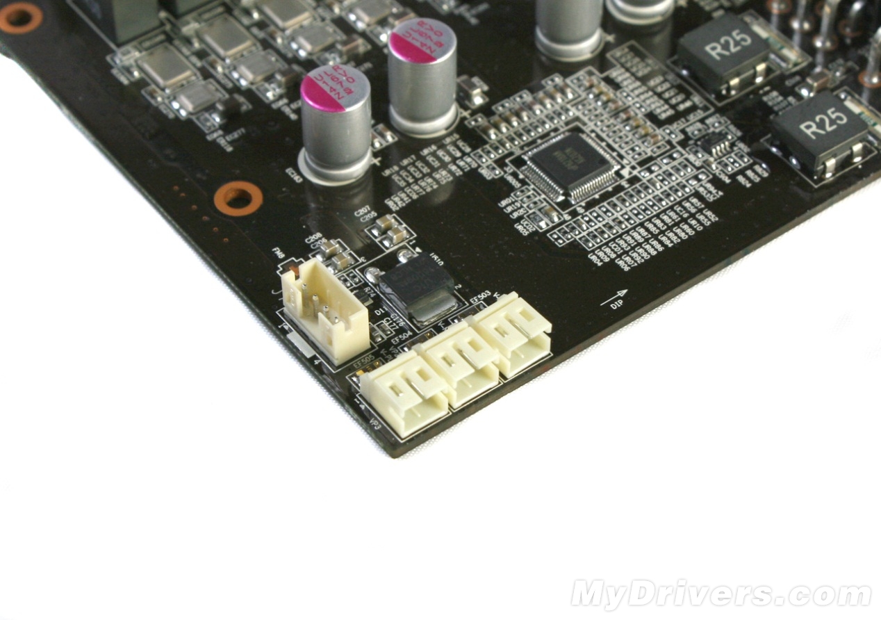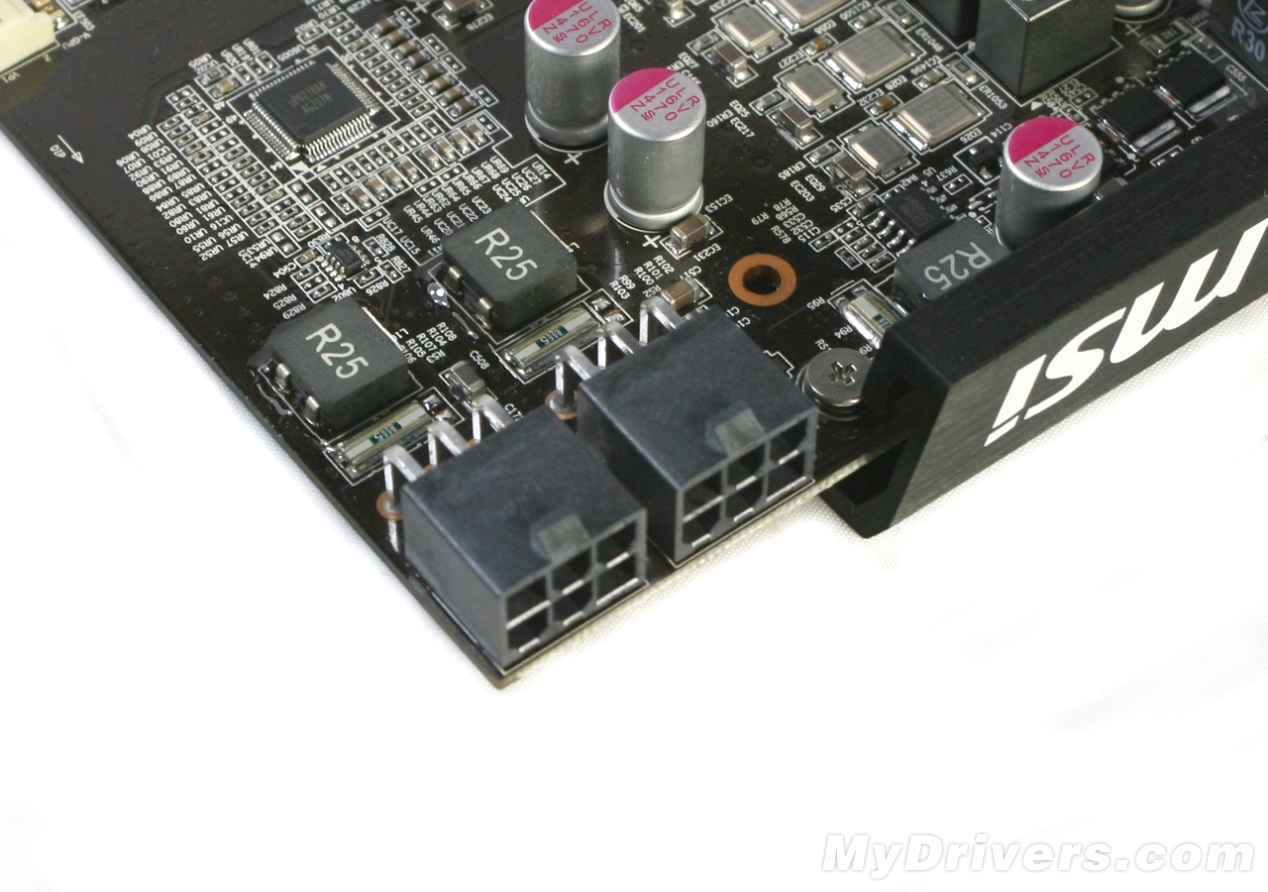 双6pin供电接口,可以看到接口下方还安置了两颗R25滤波电感,目的也很简单,同样是为了保证输入电流的稳定性。