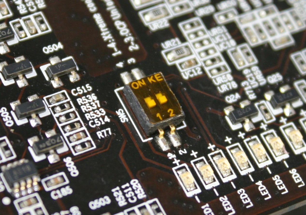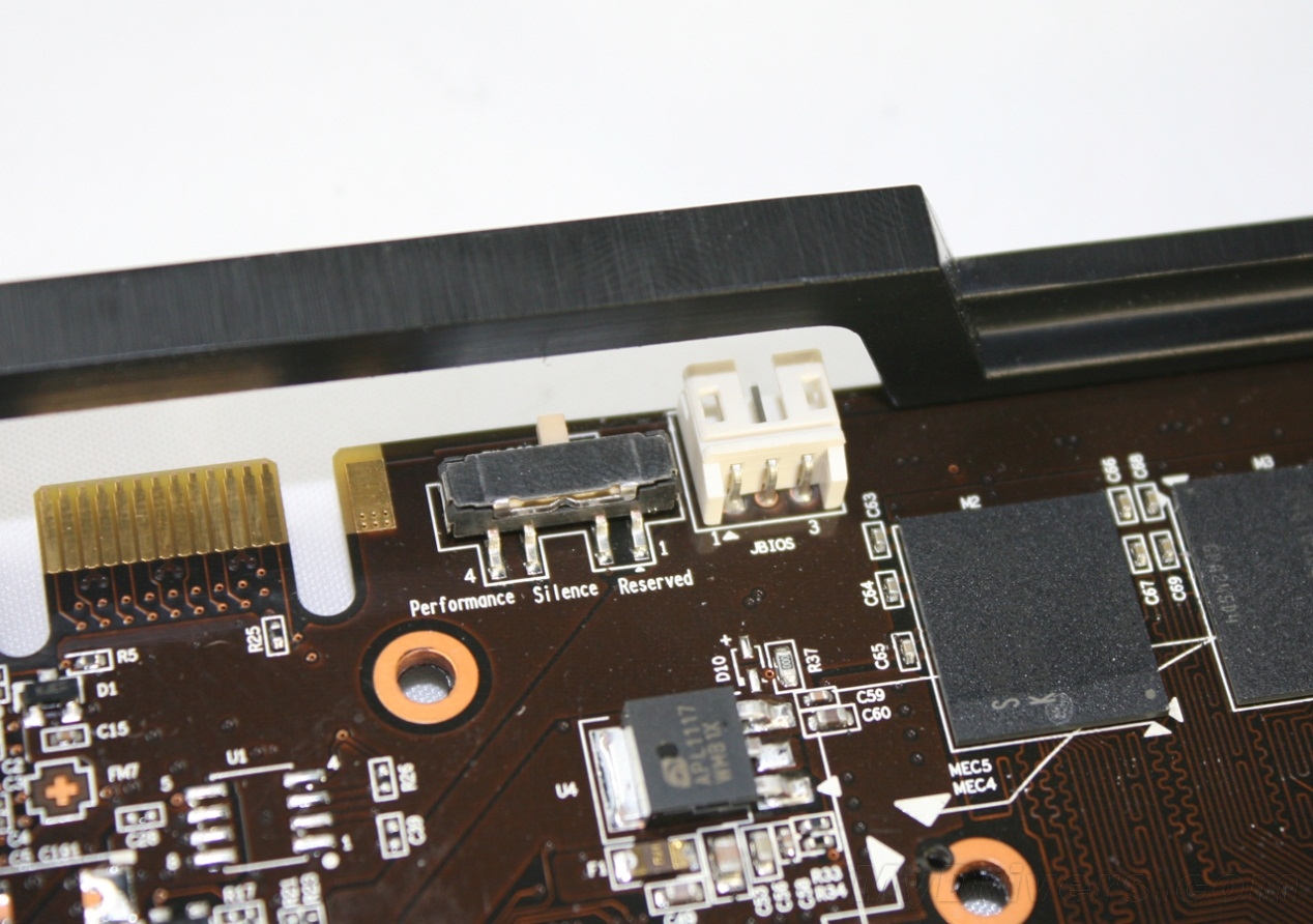 除此之外,PCB左上方还提供了BIOS切换开关,初级用户可以通过调节开关使显卡分别运行在性能、静音等状态,满足不同用户在对性能的不同需求。