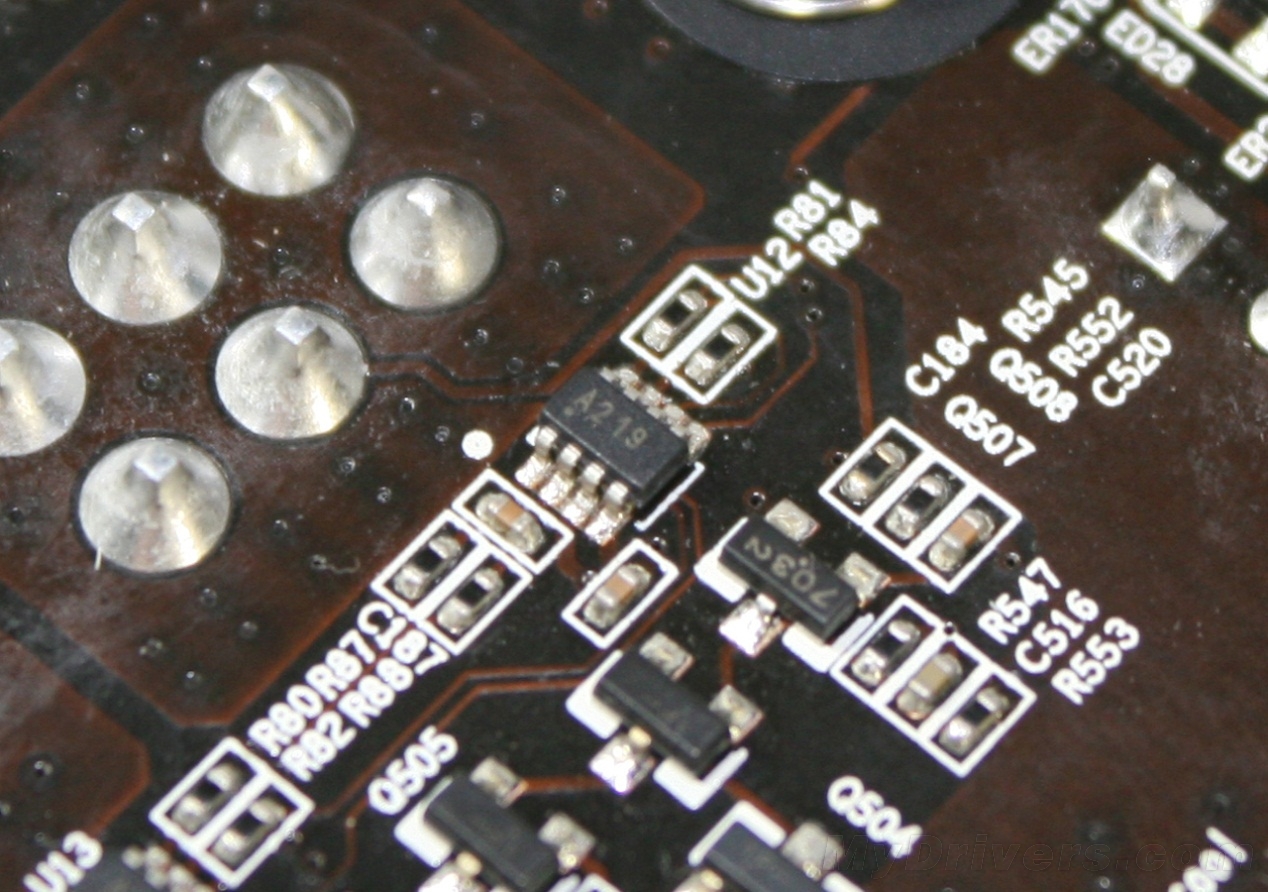 与其它非公版GTX 560 Ti显卡不同,出于谨慎考虑,微星还是加入了数颗A129芯片,用于功耗保护。当显卡超过功耗临界值时,显卡会触发功耗保护电容,自动降低频率。事实上,这种极限状态很少能够碰到,普通用户在日常使用时并不必担心显卡性能会受到影响。当然,对于热爱超频的玩家来讲,可以通过上面的OCP Unlock开关进行关闭,从而使显卡释放更加强大的超频潜力。