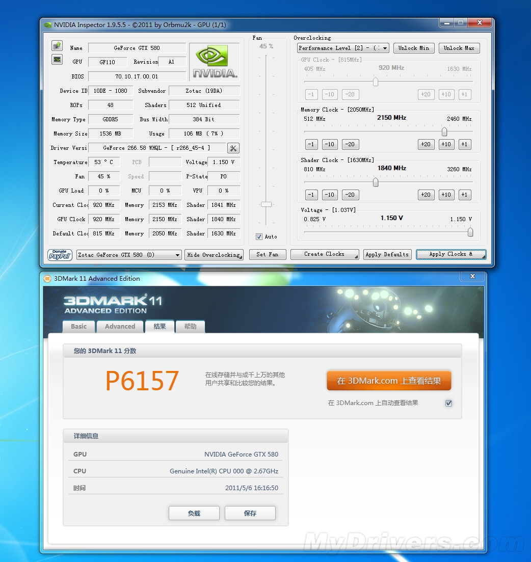 经过数次尝试,我们最终将显卡的核心/Shader/显存频率分别超频至920/1840/4300MHz,保存后顺利通过3DMark 11测试,其中p档得分达到了6157分。虽然未能突破1GHz大关,但如此表现相比默认815/1630/4100MHz的性能提升已经相当明显了。