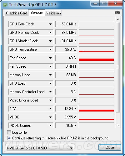 温度部分,选取显卡2D待机、满载(Crysis)两种状态,利用GPU-Z实时监控,待连续运行10分钟峰值温度稳定后,记录此时显卡核心两种频率下最高温度。(室温25℃左右)