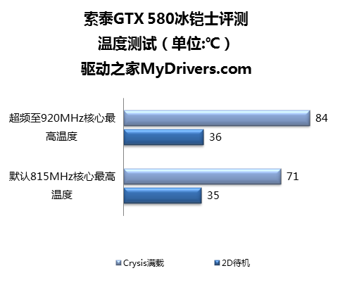 从测试结果来看,一体化水冷散热系统还是发挥出了不错的效果, 在比公版GTX 580默认核心频率高出将近100MHz的情况下,仍然给出了待机35℃、满载71℃的表现,即便超频是920920/1840/4300MHz,温度依然被压制在待机36℃、满载84℃的水平。