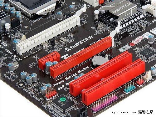 扩展插槽方面,映泰TZ68A+主板提供了2条PCI-E x16 2.0显卡插槽,可以支持X16/X4双卡模式,另外还有1条PCI-E x1插槽,和2条PCI插槽。