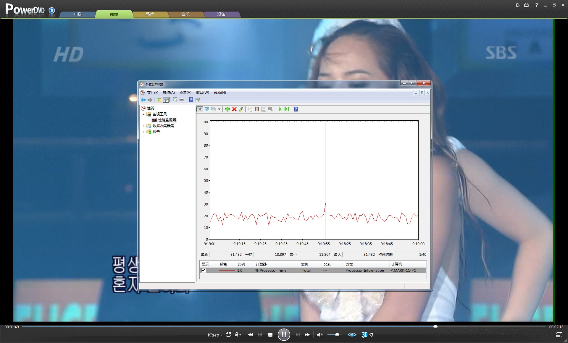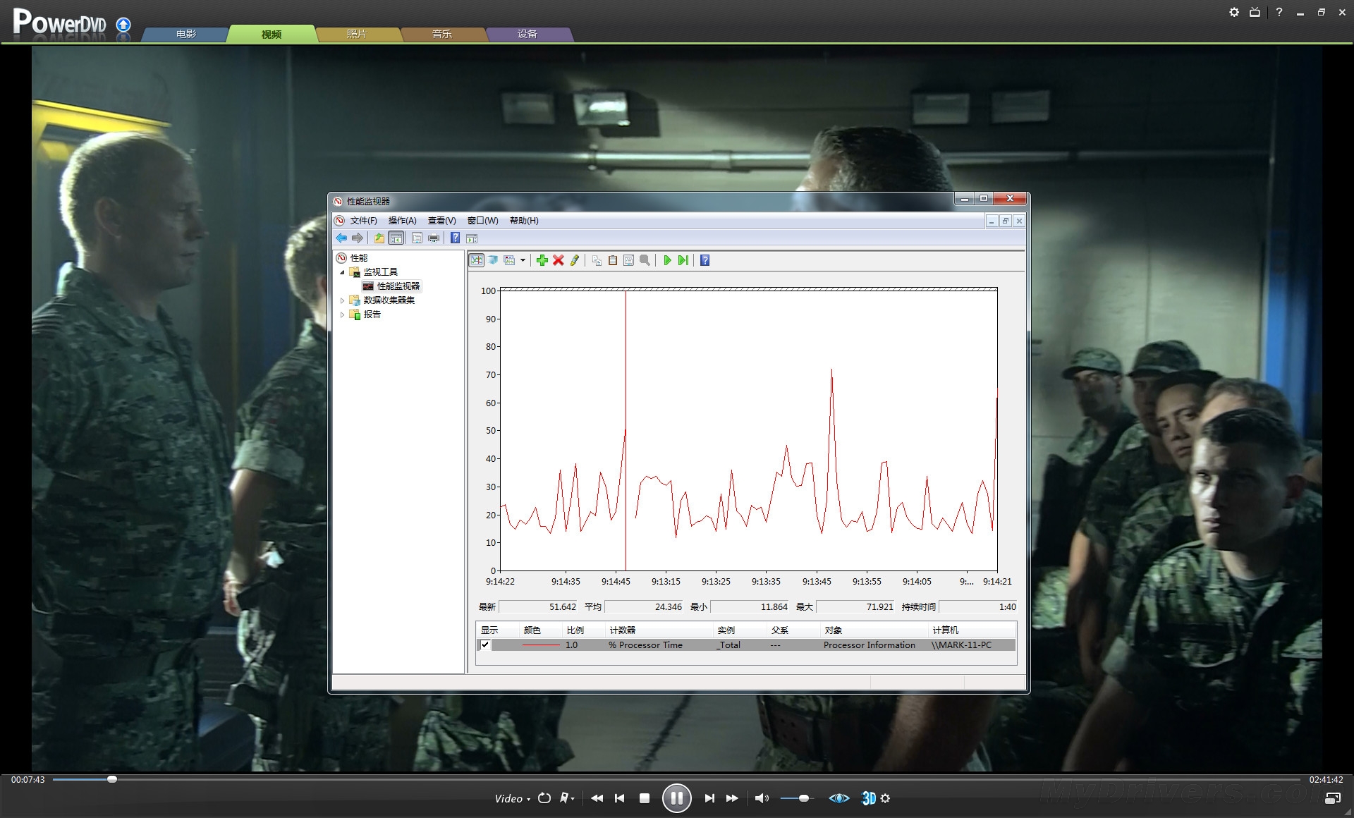 【高清解码测试】本次高清解码片源我们选择了H.264格式的《阿凡达》,1080P分辨率,平均码率18.2Mbps,最大码率为48Mbps,音频编码为杜比AC-3 192K。MPEG-2 TS影片是一段MV,1080P,平均码率16.66Mbps,音频AC-2 384K。播放器方面我们选择了Power DVD,同时打开Windows 7性能监视器,实时监控高清视频播放时的CPU占用率,最后记录下平均值。
