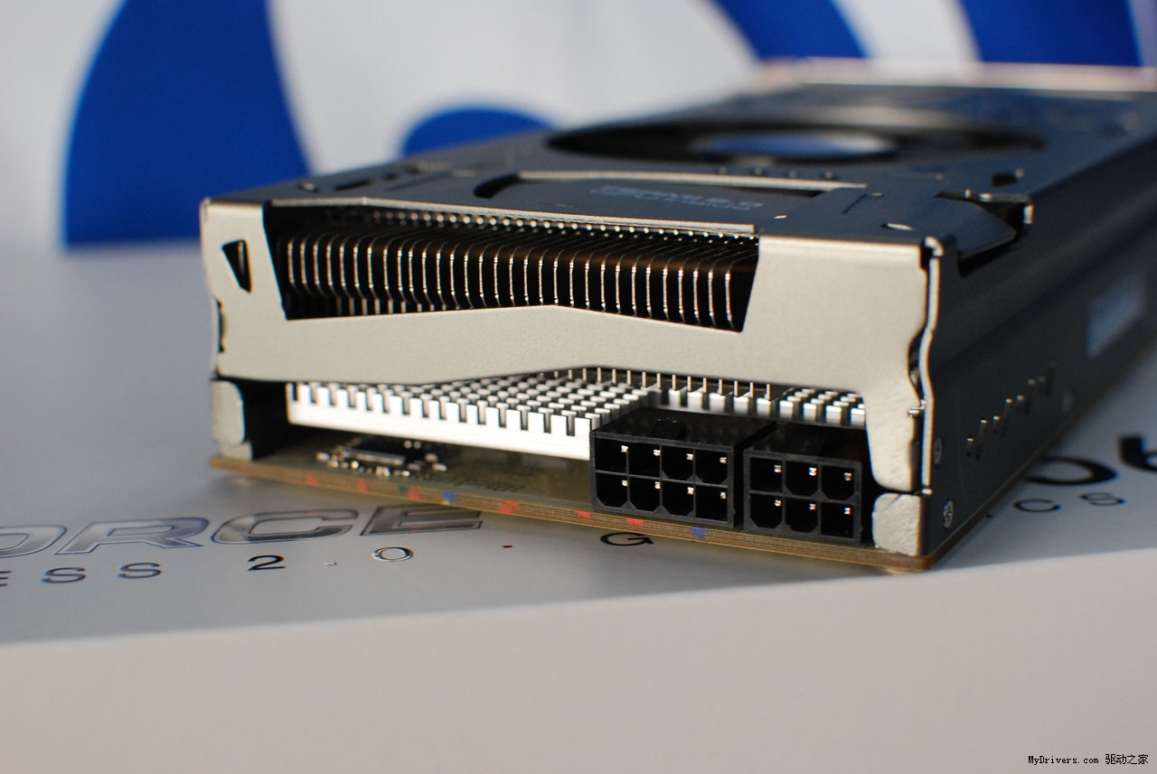 GTX560 Ti HOF强劲之处在于采用Volterra全数字供电技术,6+2相供电及全钽电容设计,其中核心供电为6相全数字供电,显存则采用2相供电。核心供电方案由VT1185M主控芯片、6颗VT1157SF从控芯片以及Bussmann CPL排感组成,每个供电环节都保持极高的开关频率,工作温度可耐200摄氏度高温,在极限超频环境下,数字供电无疑具有更大的优势。该显卡并没有采用大部分GTX 560 Ti显卡常用的双6pin供电接口,而是辅以供电能力更强的6pin+8pin设计,以满足显卡超频的需求。