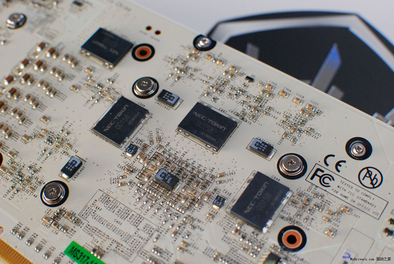 由于开关频率的提升,因此显卡用料极为奢华,除了采用大量MLCC电容,多颗POS CAP电容外,在PCB背面核心附近搭载了四颗NEC Proadlizer高速薄膜式去耦电容,拥有优秀的高频能力,容量甚至超过传统电容但ESR更低,可大大降低电源噪音,其较高的蓄电量以及高速的充放电效率亦可有效提升显卡超频能力与运行稳定性。