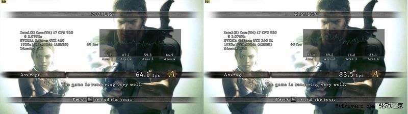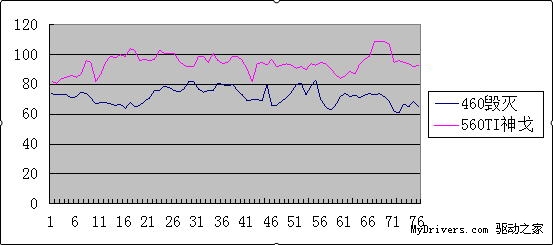 经过三个阶段的测试,索泰GTX460毁灭者第一阶段平均帧67.1帧,第二阶段平均帧59.3帧,第三阶段平均帧64.9帧,总平均帧64.1帧;昂达GTX560Ti神戈在第一阶段平均帧85帧,第二阶段平均帧89.2帧,第三阶段平均帧74.2帧,总平均帧83.5帧。两者的总平均帧相差19帧左右。
