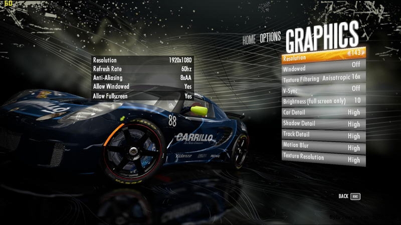 极品飞车DEMO中,显示分辨率设置为最高,抗锯齿为8XAA。