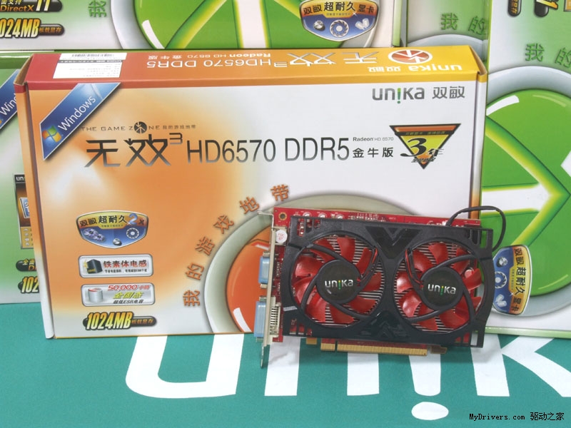 无双3 HD6570 DDR5金牛版采用Turks核心,拥有480个流处理器,核心频率650MHz,由于源自于经典Barts核心,所以HD6570拥有HD6000系列的全部特性,包括UVD3视频加速、HD3D、宽域多屏显示技术等,并搭载1024M DDR5高速显存,显存位宽128bit,频率为4000MHz。