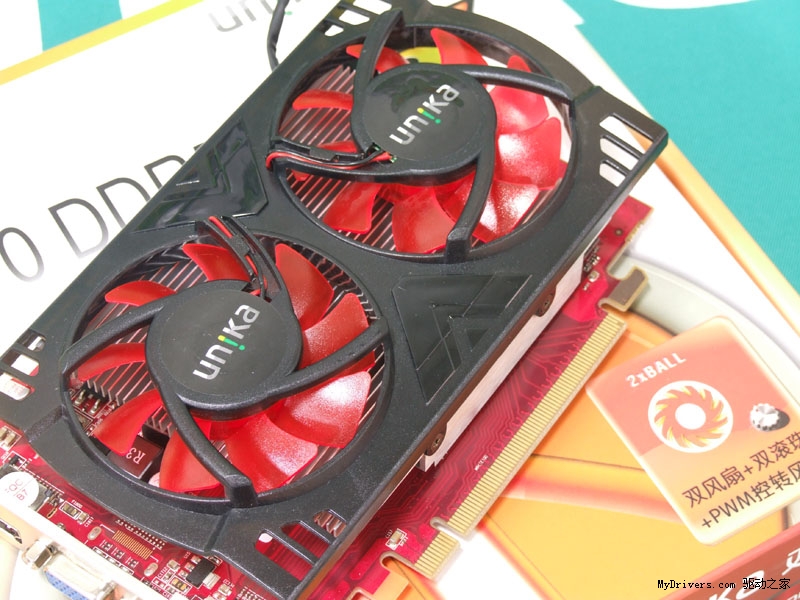 散热方面,无双3 HD6570 DDR5金牛版散热系统加入了双敏的超耐久2X散热技术,产品搭配两个悬浮式双滚珠风扇,散热效率成倍上升,独特的风道设计除了可以满足核心散热外,还可以照顾到显存、供电及PCB周边散热需求。另外值得一提的是,产品通过电路设计,为散热风扇提供了PWM智能温控散热设计功能,让产品更冷静之余还具备更好的超频潜力。