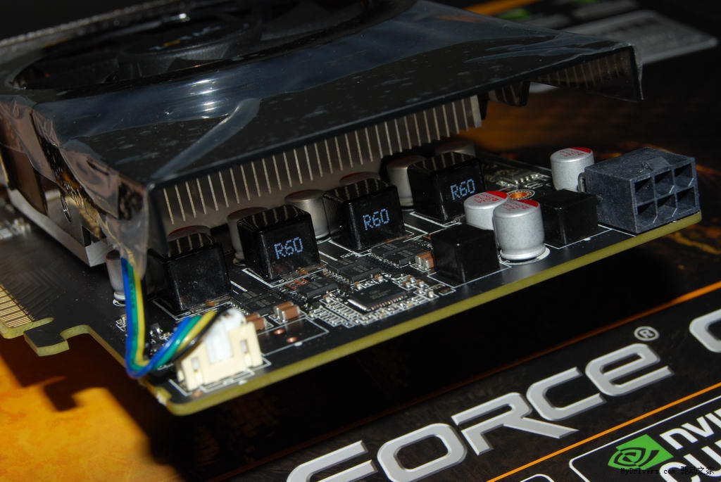 供电部分,3+1相核心显存分离式供电设计,采用全日系固态电容搭配封闭式电感,每相供电上一下二八爪鱼高效供电MOS,转换效率高之余也大大降低了发热量,加上6PIN外接供电设计,为默认高频核心提供充足供电。
