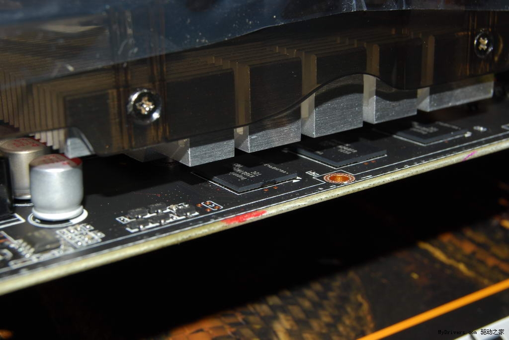 显存方面是GTX550Ti-1GB最具特色的改进,6颗0.4ns GDDR5海力士显存颗粒,组成1024MB/192bit,默认频率高达950/4100MHz,显存带宽达到98.4GB/s,大容量显存和带宽可以极流畅在1680*1050 4AA下运行游戏,这让GTX50Ti成为千元游戏显卡最吸引人之处。