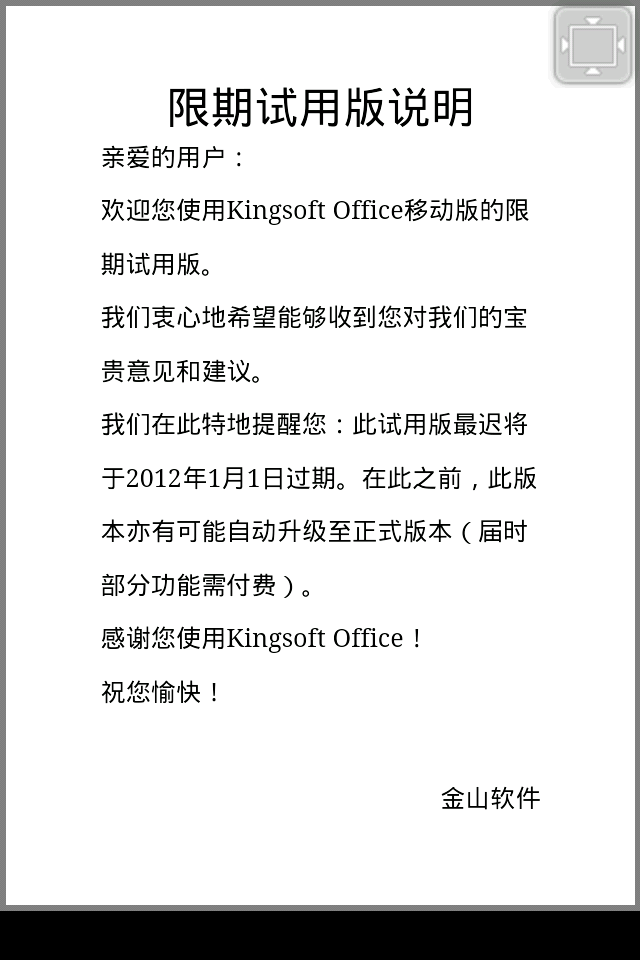 今天,国内知名办公软件金山办公软件宣布Kingsoft Office 移动版1.0.3发布(下载地址:http://mo.wps.cn/),新版本较之前有了很大的进步,同时增加了“便签模板”、“全屏显示文档”等功能。Kingsoft Office 移动版作为金山办公软件进军移动Office的首款产品,受到业界的广泛关注,“我们也想通过不断的产品更新,可以给大家带来更多移动办公新体验。”金山办公软件移动办公部总监王晖表示。