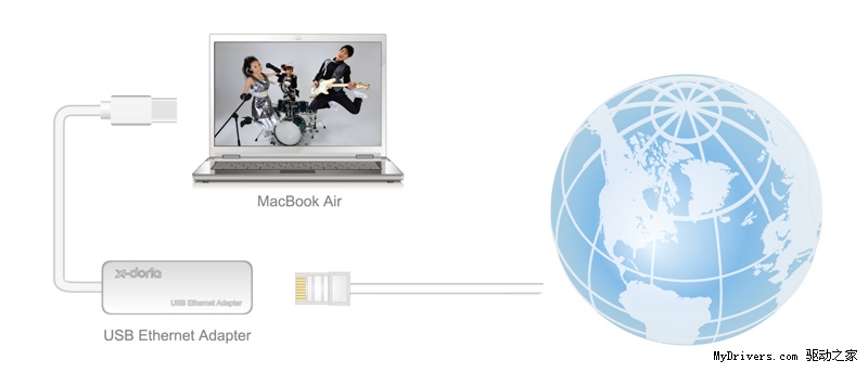 通过硬件连接,并在X-doria官方网站(www.x-doria.com)下载驱动,安装后即可正常使用,即使没有wifi,也一样让Macbook Air如同天天在星巴克中,搜罗全球最快速的信息。