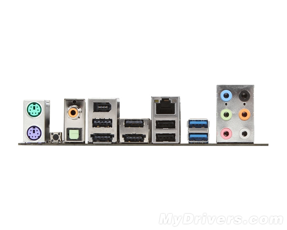 背部接口同样丰富:两个PS/2、IEEE1394a、两个Powered eSATA/USB 2.0、四个USB 2.0、两个USB 3.0、RJ-45、同轴和光纤S/PDIF、六个模拟音频口。