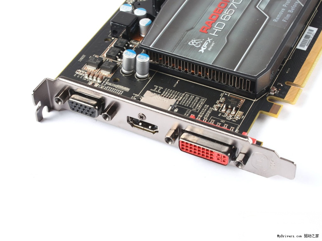 输出接口方面,XFX讯景HD-657X-ZAF 准尉版采用了VGA+DVI+HDMI的全输出方案,可以搭配目前主流的显示器,能满足大多数用户的输出需求。