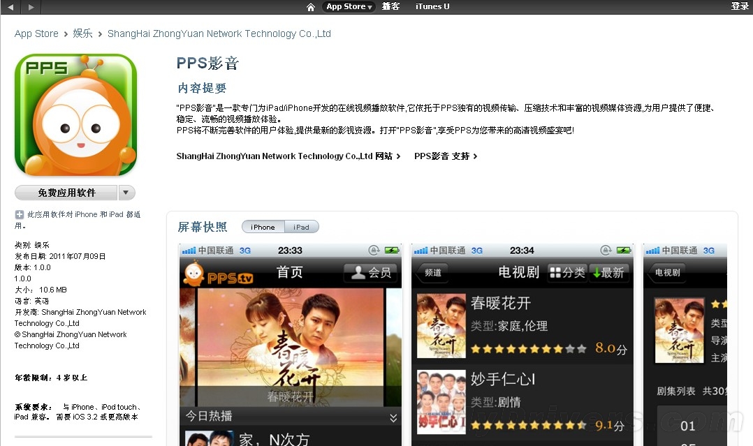 在iTunes下载页面可以看到,“PPS影音”是PPS网络电视专门为iPad/iPhone开发的在线视频播放软件,它依托于PPS独有的视频传输、压缩技术和丰富的视频媒体资源,为用户提供了便捷、稳定、流畅的视频播放体验。