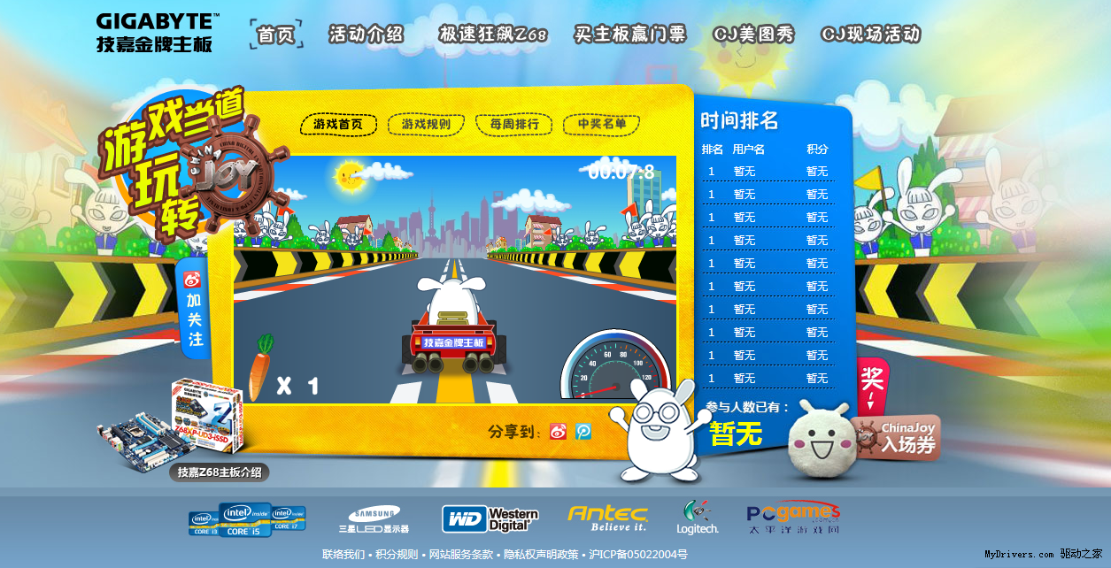 赢门票方法一:玩“极速狂飙Z68”赛车游戏,赢2011 ChinaJoy门票并有机会参加技嘉主板和SSD硬盘的抽奖活动。