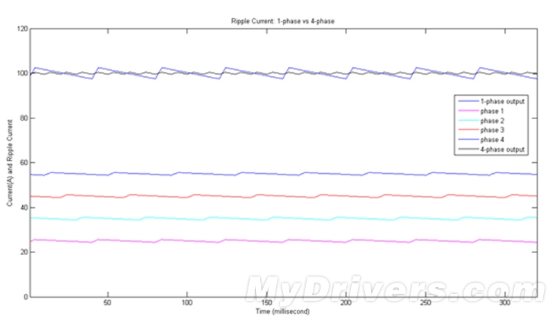 此外,使用4相核心供电的第二个好处则是:降低损耗,分散发热,提高输出容量。以GTX550Ti 1536MB神戈为例,假设电路的开关频率是f(比方说,100kHz),4个相位交错工作,等效的开关频率就是4f(也就是400kHz),更高的等效开关频率带来了更快的瞬态响应速度。另外,多相交错工作可以大大降低纹波电流(ripple current),还是以1相和4相来对比。假定输出电流都是100A,纹波电流占输出电流的5%。输入电压12V,输出电压1.2V,开关占空比是1/10。下面是电流波形的示意图。