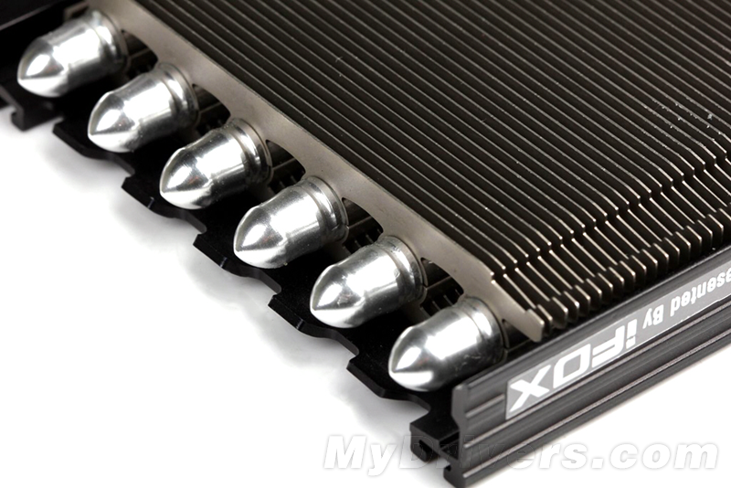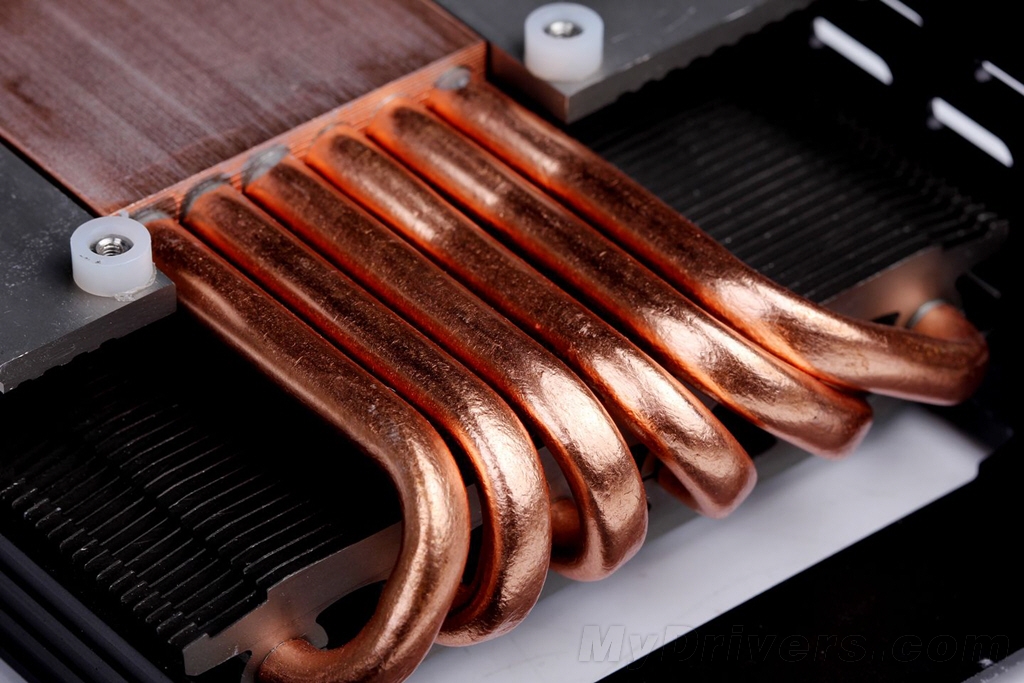 对于热管散热器,首先是散热面积。其次就是散热鳍片的数量和密度。 在热管与鳍片的结合方式上,经典的回流焊工艺淋漓尽致,通过从焊孔处的余料残留来看,该散热器用料饱满均匀,确保了热管与鳍片的紧密连接,将热损耗降至最低。工艺处理上, 六根直径6mm的纯铜导热管达到了目前显卡散热器的顶级水平。工艺处理上,每个热管均采用了表面抛光工艺,保证了美观和耐久度。排布方式上,六根热管成水平一字型排列,位于中间的四根热管,每根间距较小,这主要是考虑到对应风扇的高风量区而设计的,有利于增加散热效率。