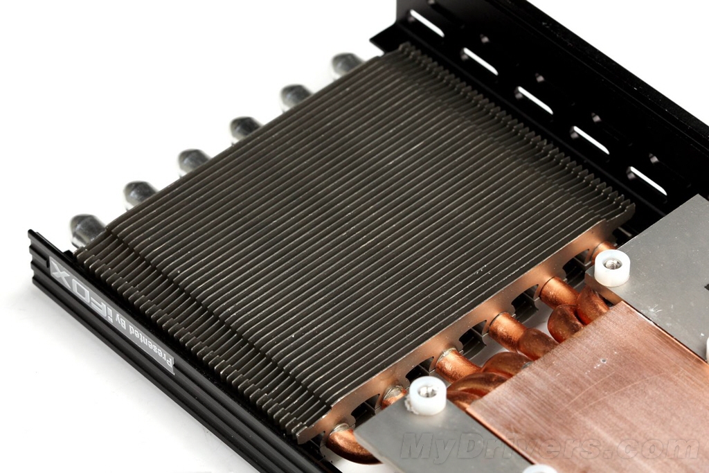 该散热器使用了显卡业界首创的六热管、可扩展模块化散热系统,最多能够搭载四个散热风扇, 比起竖串的方式,横穿式架构散热片可以使热管接触面积增加57.2%,以往这种技术只有在顶级CPU散热器上才可能看到。