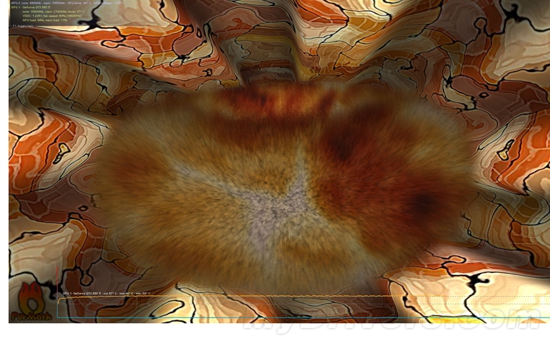经测试,配合标配的双9cm风扇,在达成Furmark峰值温度59度(1000/4200MHz超高频下)的完美温度条件下,噪音仅有40db以下。温度比公版低10-15度,噪音比公版低20%。