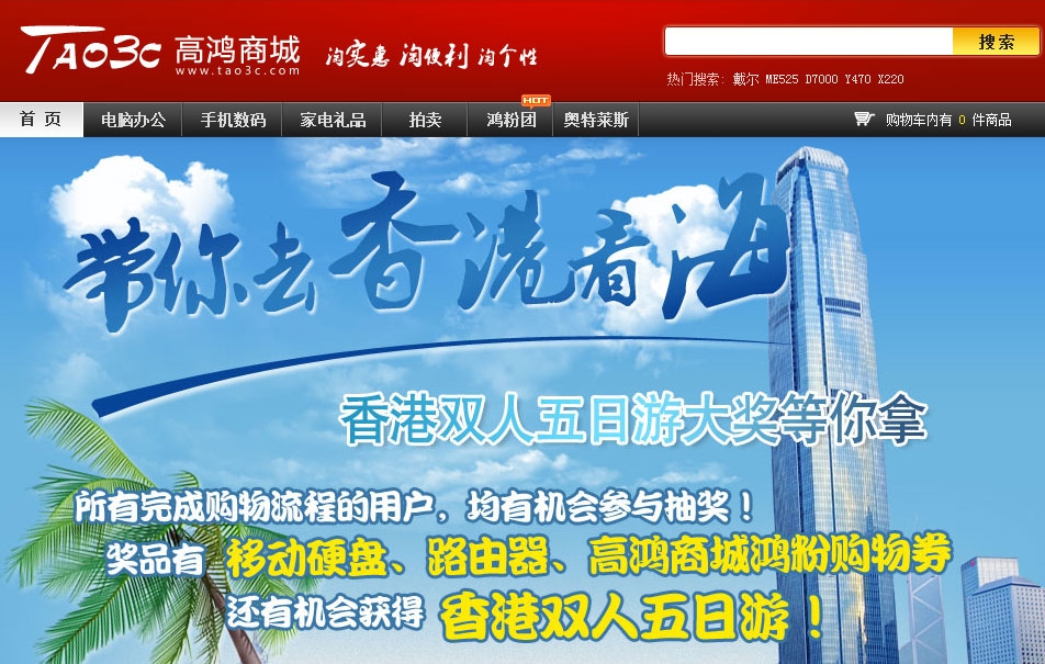 2011年7月7日,国内知名B2C商城——高鸿商城(http://www.tao3c.com)正式开启以《带起去香港看海》为主题的大型促销活动,借助暑期购物狂潮为消费者奉上一份惊喜。专注于3C产品的高鸿商城一直以来都以低价格与高保障著称,消费者可以更放心的享受更优惠的价格,因此高鸿商城深受3C消费者的青睐。现如今,高鸿商城为消费者准备了包括香港双人五日游的丰厚奖励,并在7、8日2天的鸿粉日开启满200元就送好礼的活动,让广大消费者激动一夏。