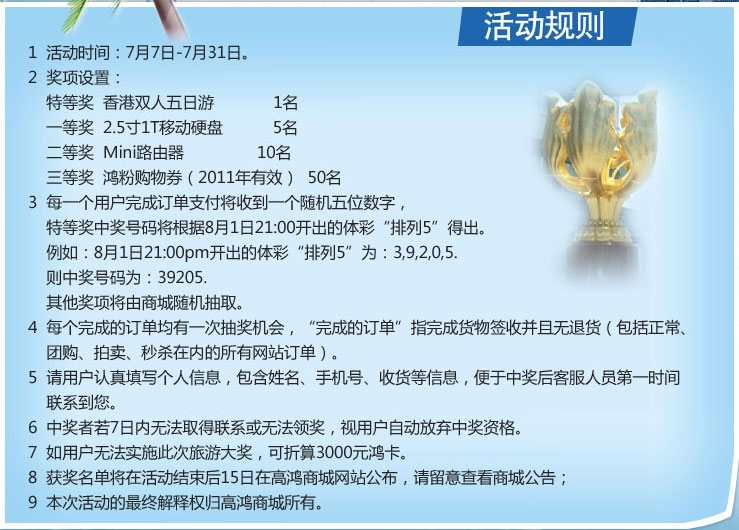 高鸿商城这次活动的奖励可谓十分丰富且诱人,奖品有移动硬盘、路由器、高鸿商城鸿粉购物劵,更有机会获得香港双人五日游,值得注意的是,如果用户无法实施旅游大奖,高鸿商城还提供3000远鸿卡可供选择,充满人性化的奖励模式。而只要在活动期间完成订单,就有机会获得这些奖励。还等什么,赶快参与到其中吧,说不定您就是旅游大奖的获得者。如果想了解更多活动详情,请登录活动主页进行查询:http://www.tao3c.com/staticpage/20110705/Gotosea.jsp。
