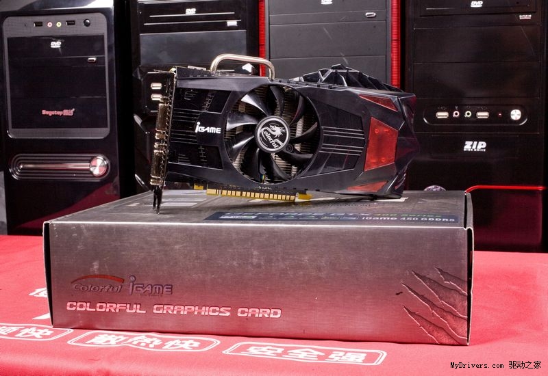 散热方面: iGame450 烈焰战神U显卡在外盖上利用了鲨鱼腮状的开孔,目的就是为了增强散热气流的透气性。以往显卡在造型上的设计大都遵循整体式散热,整体式散热的缺点就是无法完好的照顾到某些局部区域的散热,导致显卡热量无法快速排出卡外。而鲨鱼的鱼鳍既能作为推进动力又能导向,考虑到这个特点,在显卡外盖上加入仿生设计能够增强显卡散热气流的导流性。