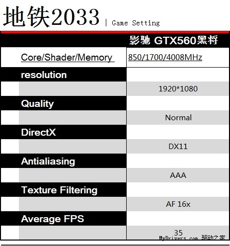 作为最新的显卡杀手,《地铁2033》在画质上以及对显卡的要求大幅超越了所有游戏。而影驰GTX560黑将虽然有着336个CUDA核心高端级别的规格,但面对《地铁2033》强劲的特效与可怕的硬件要求下,GTX560黑将在高画质以上有点力不从“心”。而针对这点我们则降低了特效。在1920*1080分辨率下的普通特效(详细请参考之前游戏设置)跑出确保最基础流畅度与游戏体验的30FPS。而在大多数显卡在中特效也不能流畅运行,可见影驰GTX560黑将的强劲性能。