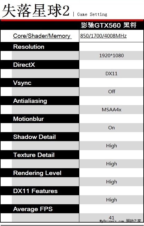 《失落的星球》续作《失落的星球2》以作为DX11游戏的身份登场。虽然是一款较为早期的DX11游戏,但凭借着众多DX11特效,游戏画面比起以前的DX9、DX10游戏更加逼真,效果更加华丽。而DX11对显卡的要求也是显而易见。而通过Feimi2.0架构优化并且搭配336个CUDA CORE的影驰GTX560黑将在开启4x msaa下依然能够保持40fps的好成绩。在DX11游戏下开启抗锯齿也能拥有如此高的FPS,影驰GTX560黑将将自身的性能发挥到淋漓尽致。
