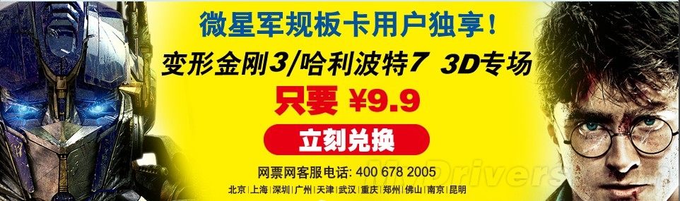 活动内容:购买任意一款微星主板或显卡, 输入外盒活动贴纸上的卡号及密码,即可在网票网购买到《变形金刚3》《哈利波特7(下)》9.9元的影票。在线选座!超低票价!解决你的一切担忧烦恼!